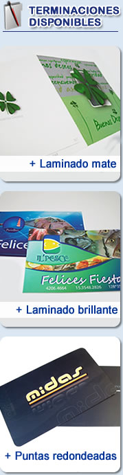 El laminado es un film de plastificado que se aplica a la impresión, y le da una terminación más intensa y esta puede ser MATE (opaco) o BRILLANTE. Al aplicarse de ambas caras la tarjeta quedará más rigida y su durabilidad será mucho mayor debido a que queda completamente protegida contra mal tratos, humedad, etc.